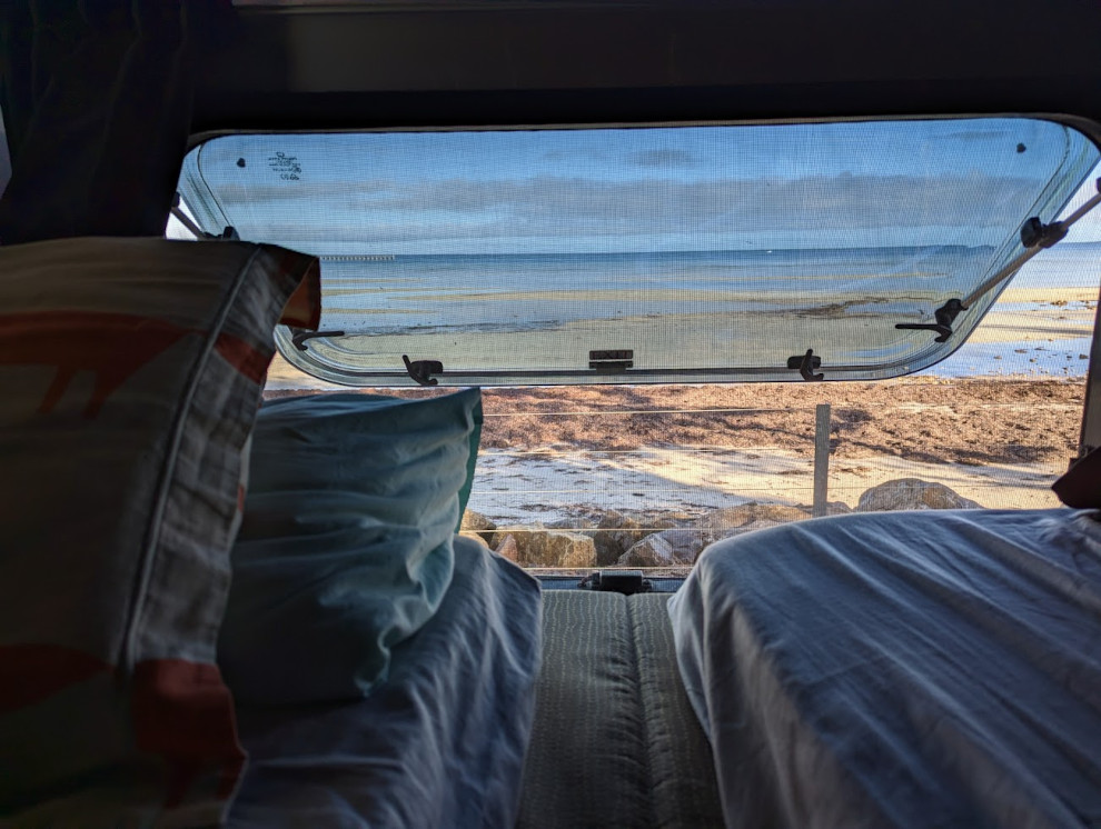 This morning before we had barely even gotten out of bed, some dickhead knocked on our door about 8am asking to take a look inside our caravan, along with a million questions about our van that a quick Google search could have answered. Definitely an annoying start to the day!